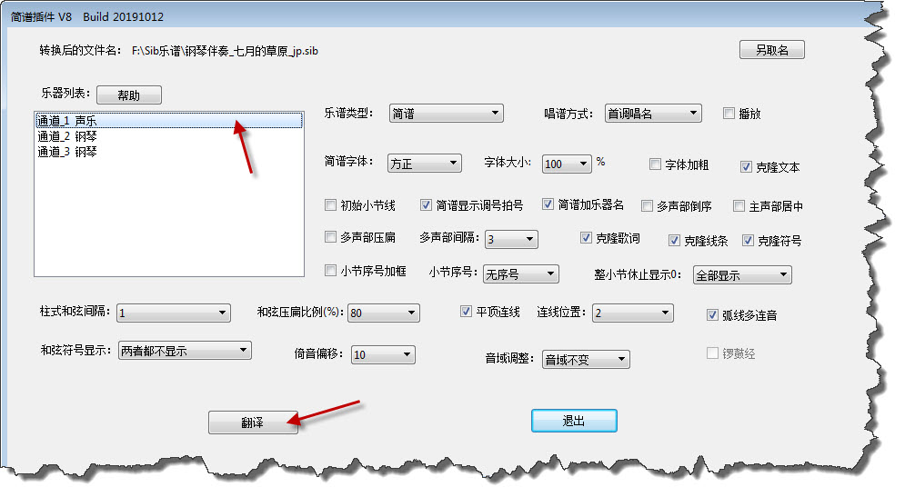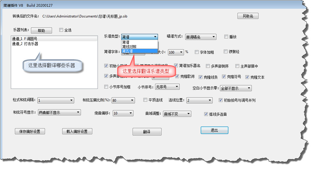简谱插件窗口:在左边乐器列表中选择乐器,可以按住Ctrl或Shift键进行多选。设置好参数然后按《翻译按钮》。 :