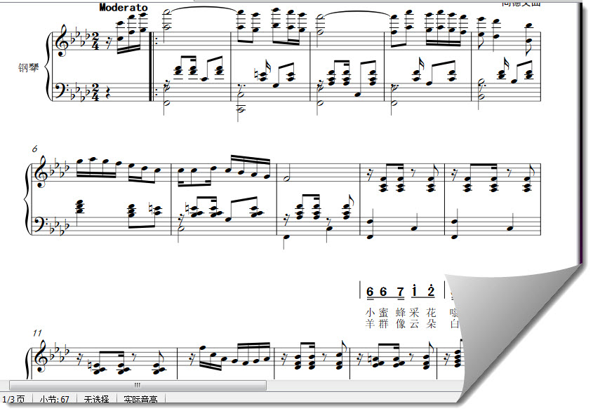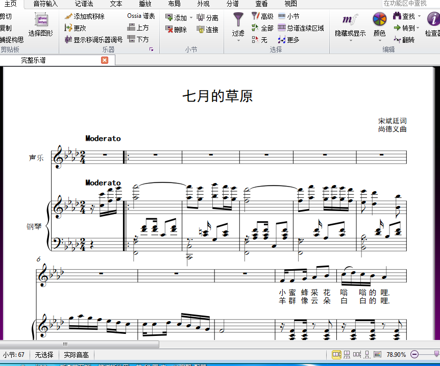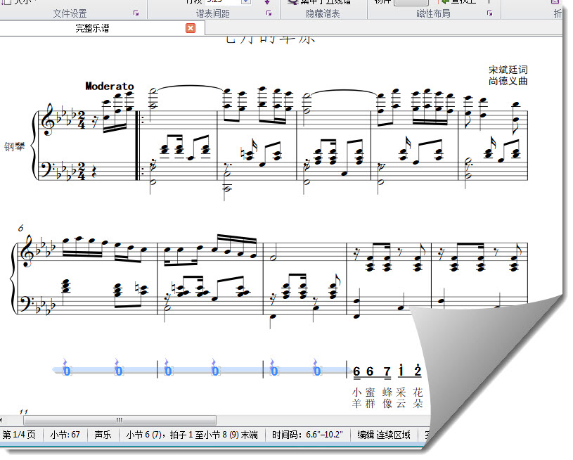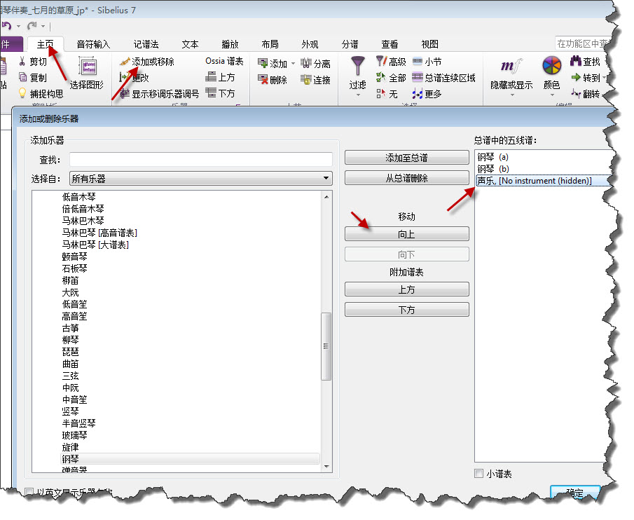 现在前面的空白行和空白小节都已经隐藏,但是声乐谱在钢琴的下面,如何调整它的位置呢?