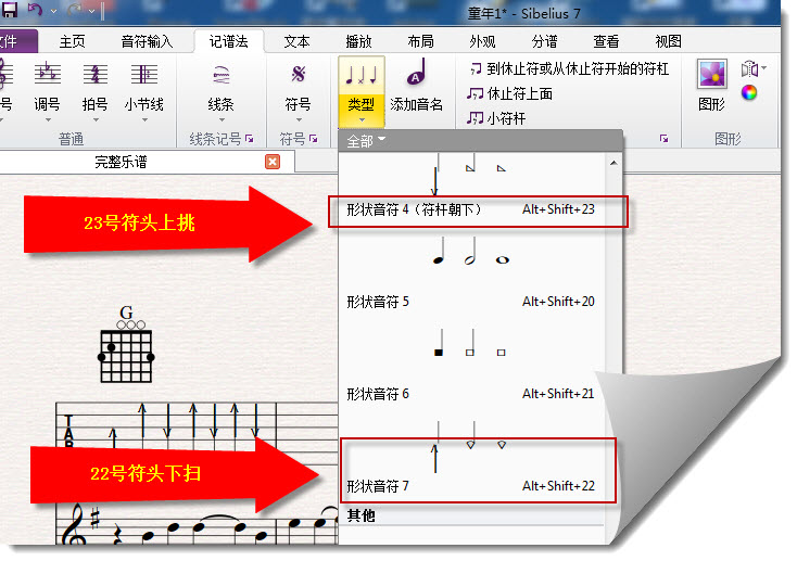 在乐器《吉他(扫弦)》中输入音符:上挑扫弦使用23号符头,下扫扫弦使用22号符头,上下位置可以用方向键调整