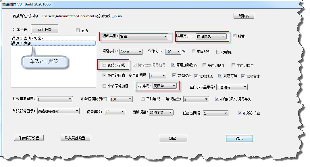 在打开简谱插件只翻译旋律部分:单击通道2(旋律),作好相应的设置,点击《翻译》