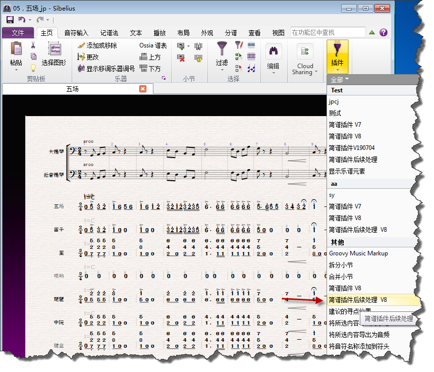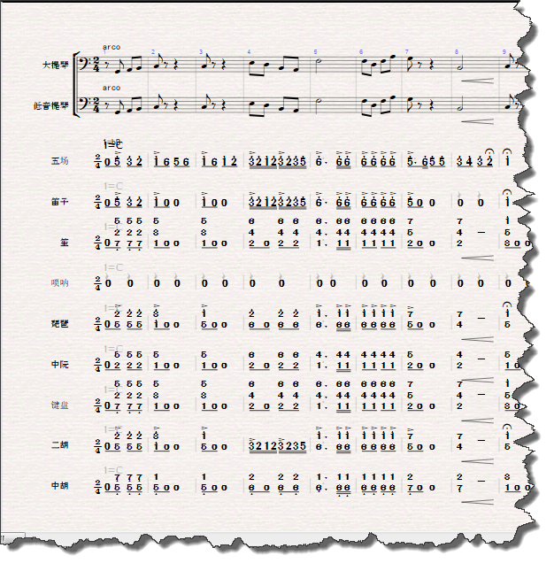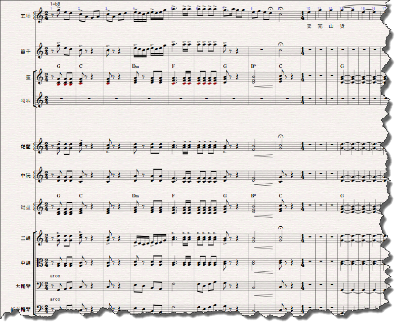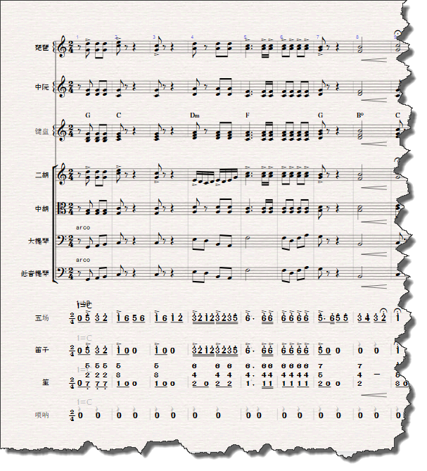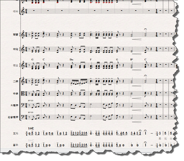 这份总谱中有民族乐器也有西洋乐器,有九百多小节。