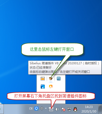 1.简谱插件运行后,在屏幕右下方托盘区有简谱插件的图标。在图标上击鼠标左键打开窗口: